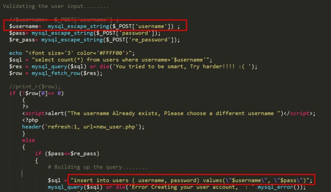 看了源码才知道,这里输入的用户名和密码都经过了mysql_real_escape_string()这个函数的处理。